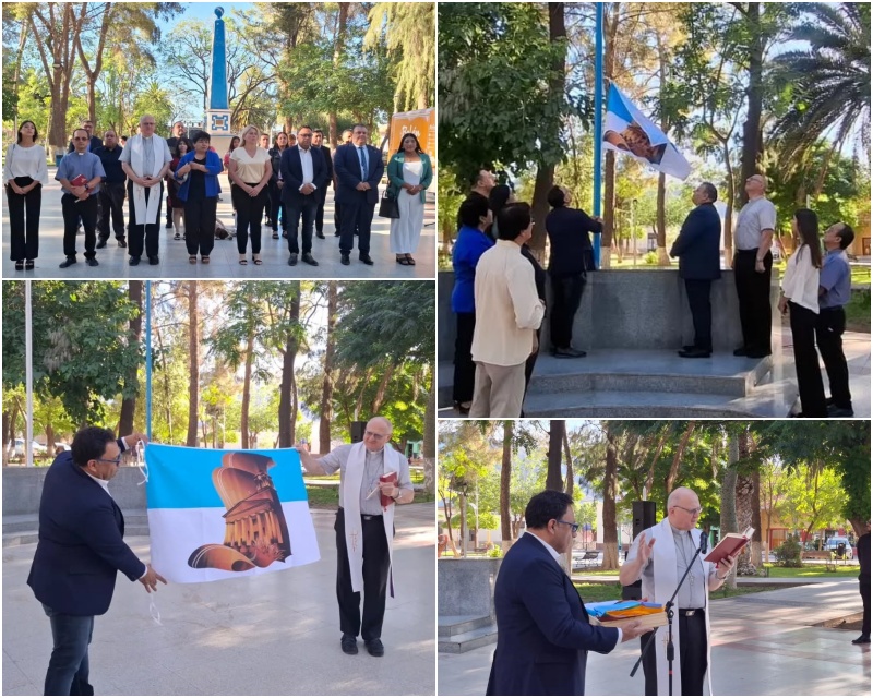 Un momento de especial solemnidad se vivió cuando el Obispo de la Diócesis de Catamarca, Monseñor Luis Urbanc, procedió a realizar la bendición de la Bandera de Belén, consagrando así el nuevo símbolo antes de ser elevado al cielo.