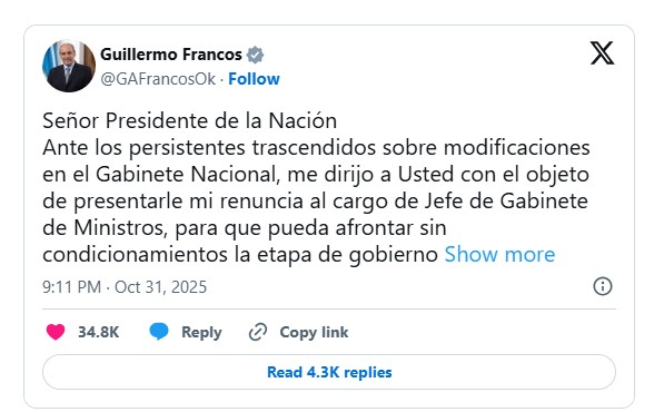 Minutos antes, Francos había hecho pública su dimisión vía X. Según redactó, «ante los persistentes trascendidos sobre modificaciones en el Gabinete Nacional» le presentó la renuncia a Milei «para que pueda afrontar sin condicionamientos la etapa de gobierno que se inicia luego de las elecciones nacionales del pasado 26 de octubre».
