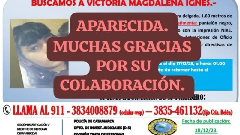 El personal de Trata de Personas de la provincia, comunicó que la joven de Belén que era intensamente buscada, ya fue encontrada.
