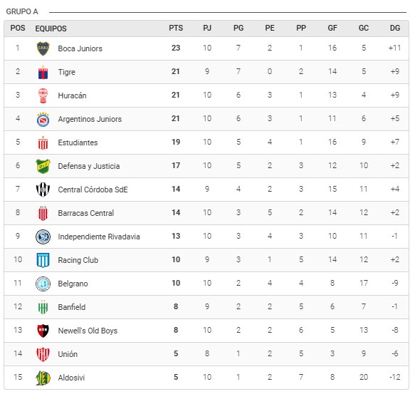 TABLA DE POSICIONES DEL TORNEO APERTURA