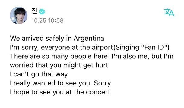 Las últimas novedades sobre Seokjin habían sido el domingo 23 a las 21.46 (hora Argentina) cuando el artista se encontraba dentro del avión en el aeropuerto de Incheon y había subido una selfie a Weverse – la plataforma utilizada por fans del k-pop para interactuar con los artistas -.