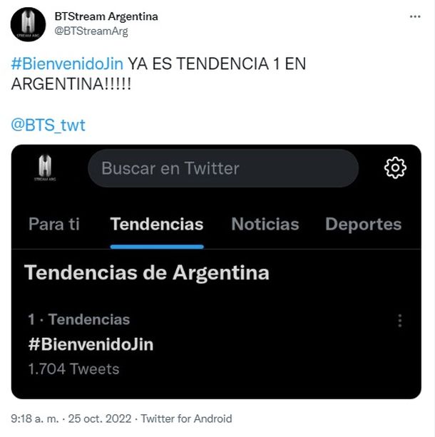 #JinEnArgentina y #BienvenidoJin fueron las primeras tendencias en Twitter Argentina desde la mañana. Con ambos hashtags, fans y ARMY compartieron la emoción por la llegada del artista de BTS, celebrando la importancia de su visita a un país de Latinoamérica.