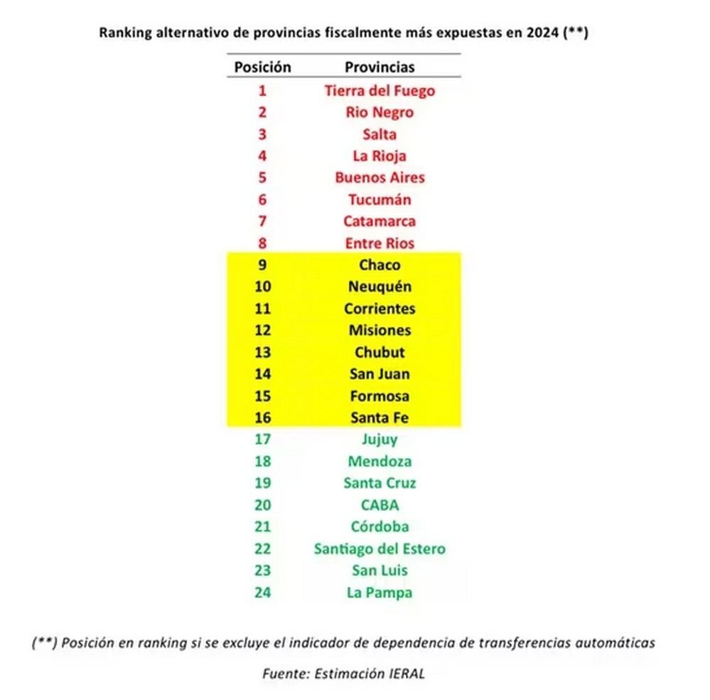 «Como consecuencia de la caída en la recaudación del impuesto a las ganancias y de otros impuestos coparticipables a provincias, las provincias más expuestas en este sentido son aquellas cuyos ingresos dependen en mayor medida de las transferencias automáticas de Nación (por coparticipación y otras leyes especiales de distribución)», explica, añadiendo que las jurisdicciones más vulnerables son Formosa y Corrientes, con 80% de sus ingresos totales, seguidas por Santiago del Estero (77%), La Rioja (76%) y Jujuy, Chaco y Catamarca (74%).