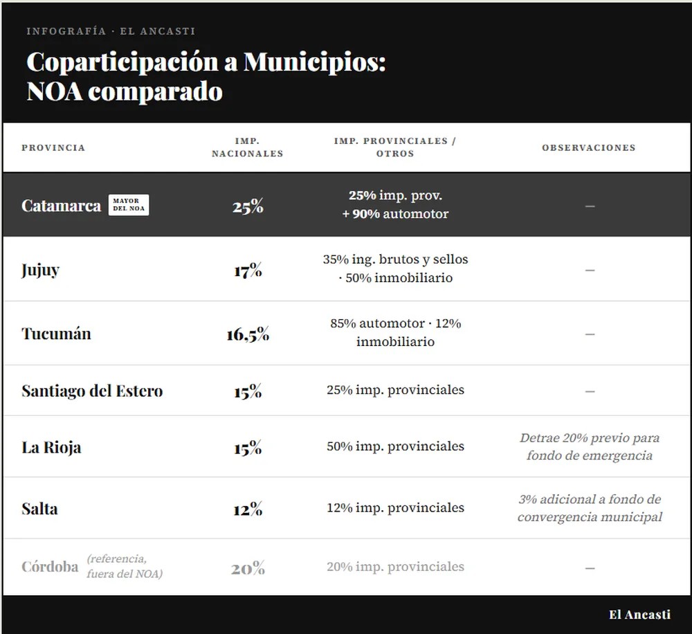 Catamarca transfiere a sus municipios el 25% de los impuestos nacionales coparticipables, el 90% del impuesto automotor y el 25% del resto de los impuestos provinciales, lo que la posiciona como la provincia del Noroeste Argentino que mayor porcentaje de recursos distribuye a sus gobiernos locales. El dato surge de un análisis comparativo de los regímenes vigentes en el NOA, en el que las demás provincias de la región presentan porcentajes de transferencia menores: Tucumán distribuye el 16,5% de impuestos nacionales; Jujuy el 17%; Salta el 12%; Santiago del Estero el 15%; y La Rioja el 15%, con una detracción previa del 20% para un fondo de emergencia antes de distribuir. Córdoba, fuera del NOA pero como referencia, transfiere el 20% tanto de impuestos nacionales como provinciales.
