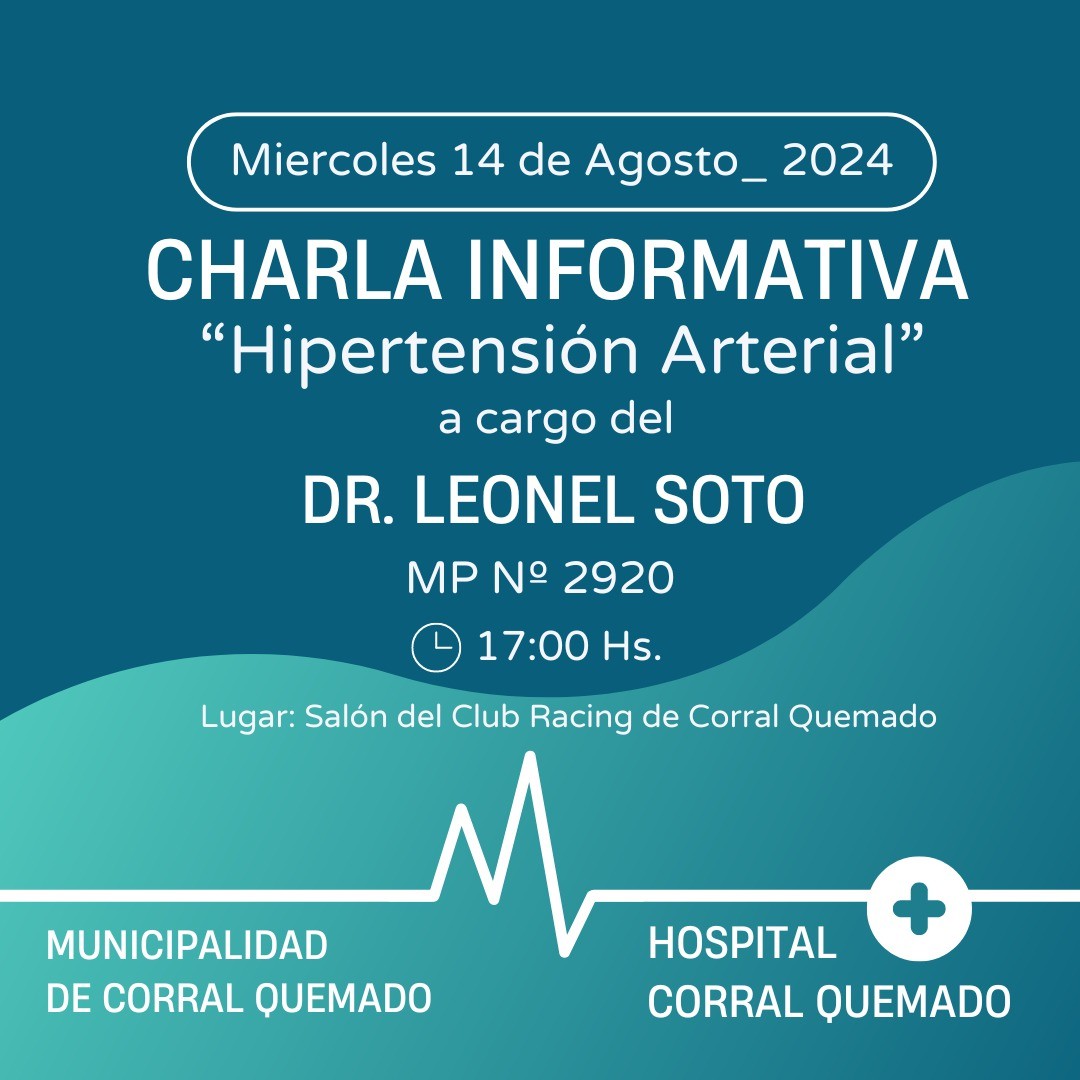 Este miércoles 14 de Agosto en el Salón del Club Racing de Corral Quemado se llevará a cabo una charla Informativa sobre » Hipertensión Arterial», la misma se desarrollará a partir de las 17 horas y su disertante será el Dr. Leonel Soto. información suministrada por el Área programática N°11