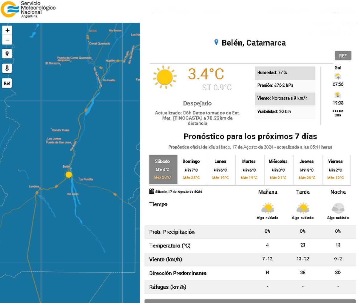 El pronóstico del tiempo para la ciudad de Belén para este sábado 17 de agosto, indica el cielo algo nublado con temperaturas de 4°grados de mínima y 23° grados de máxima