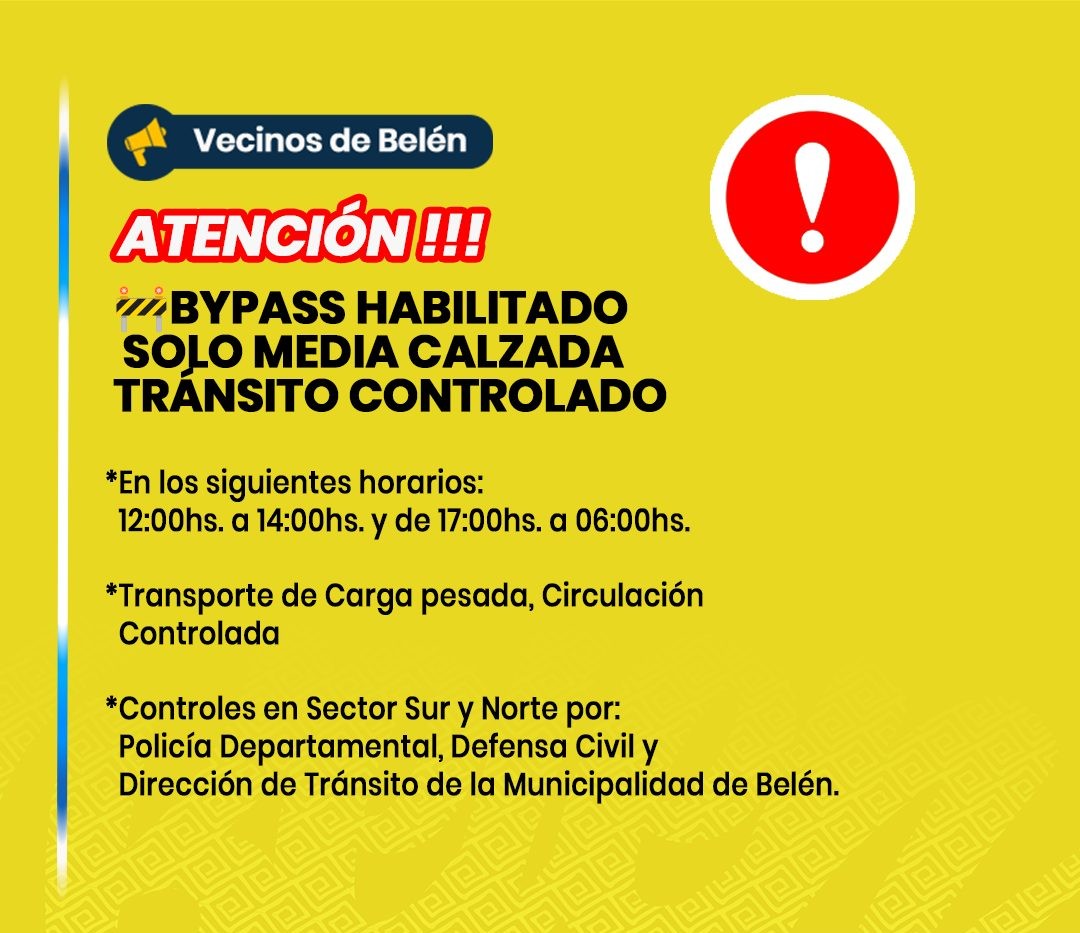 En el día de ayer se reunieron en despacho del Intendente Municipal Dr. Cristian Yapura con autoridades de Vialidad Nacional, Vialidad Provincial, Policía Departamental, Defensa Civil y la Dirección de Tránsito de la Municipalidad de la Ciudad de Belén para implementar un protocolo sobre el tránsito pesado en el Bypass de Belén, el cual se habilitará en MEDIA CALZADA en los siguientes horarios de 12:00hs. a 14:00hs. y de 17:00hs. a 06:00hs. Con tránsito controlado.