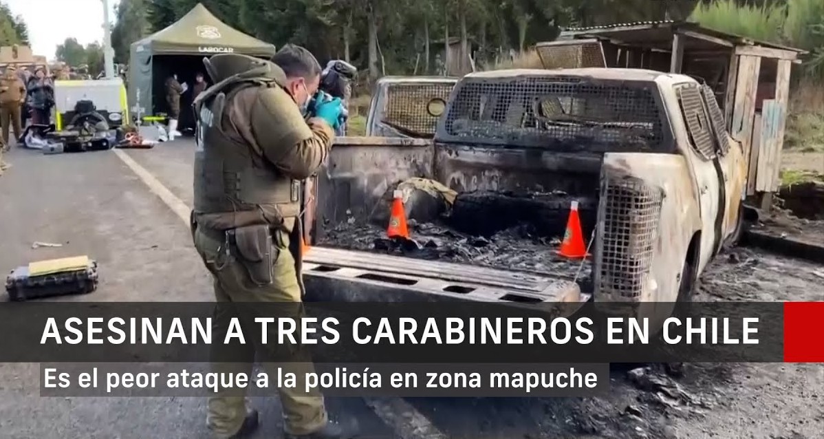 Tres agentes del cuerpo militarizado de policía Carabineros de Chile murieron hoy en un ataque en La Araucanía, una región que es escenario de un conflicto ancestral entre pueblos originarios, el gobierno y grandes empresarios latifundistas y forestales que explotan tierras y bosques milenarios.