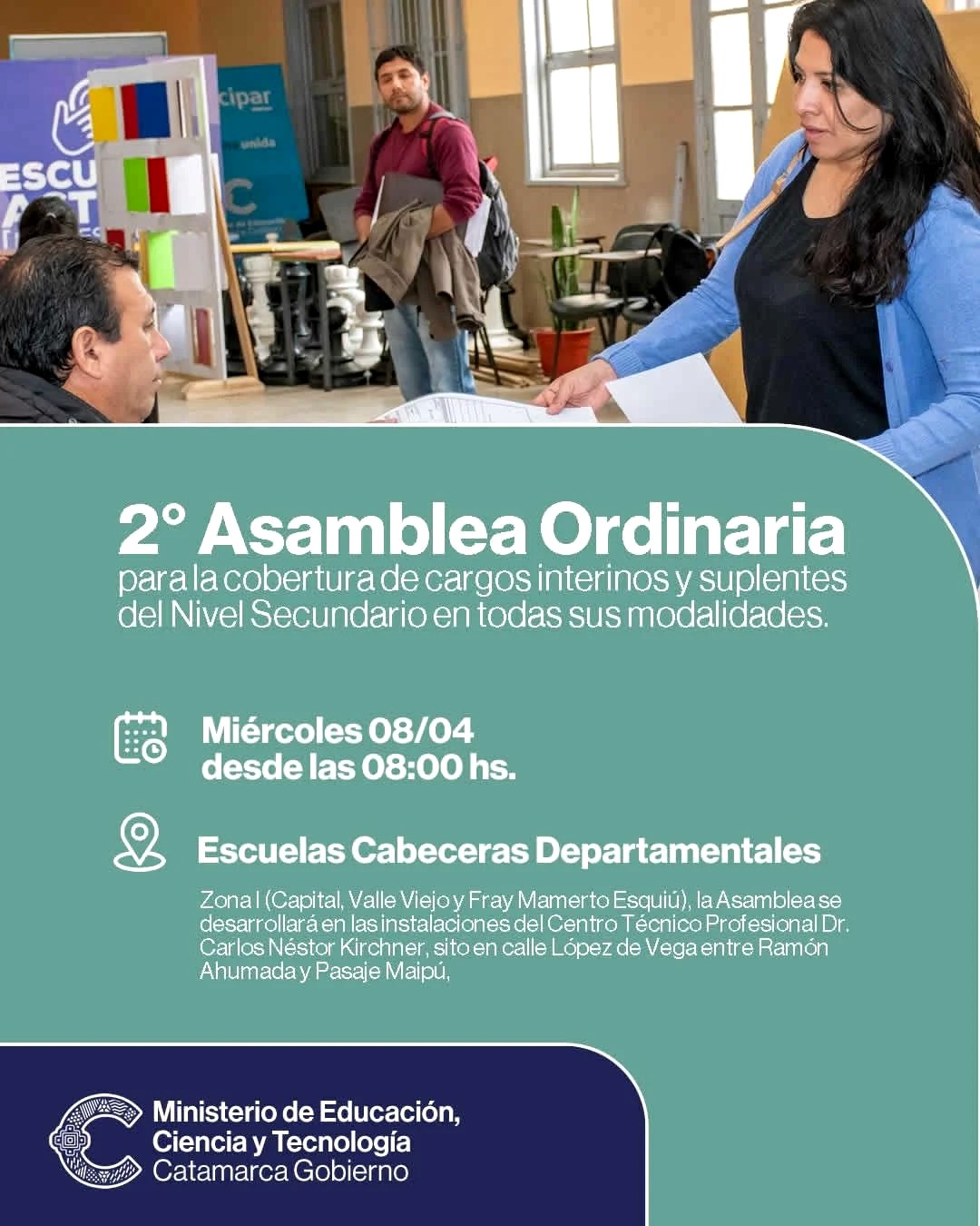 El Ministerio de Educación, Ciencia y Tecnología de la Provincia informó la convocatoria a la 2° Asamblea Ordinaria destinada a la cobertura de cargos interinos y suplentes en los distintos niveles del sistema educativo.