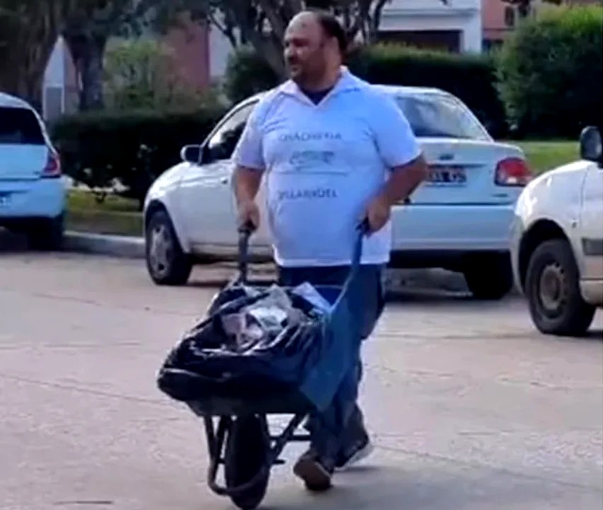 El dueño de una carnicería local se justificó señalando que “no tengo maletín para traer tanta plata, así que la traigo en carretilla», e hizo hincapié en que esos son sus ahorros que con esfuerzo pudo juntar en un contexto de baja de ventas.