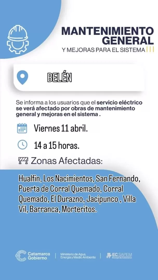 La Empresa EC SAPEM anunció un corte de energía programado para este viernes 11 de Abril en Belén. Esto debido a trabajos de mantenimiento y mejoras en el sistema eléctrico.