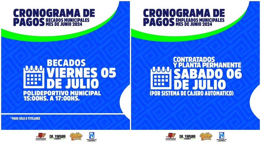 La Municipalidad de Belén informa que este viernes 5 y sábado 6 de Julio se llevará a cabo el pago a empleados municipales contratados y de planta permanente y becados.