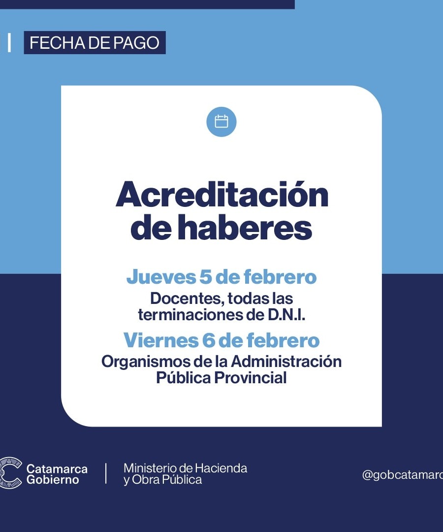 El Ministerio de Hacienda y Obra Pública anuncia que ya fue establecido el cronograma de acreditación de haberes del mes de enero de 2026 para la Administración Pública provincial, que se cumplirá de la siguiente manera: