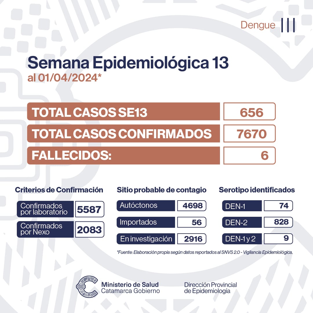 El Ministerio de Salud informa que durante la Semana Epidemiológica 13, del 25 de marzo al 1° de abril de 2024, se registraron 656 nuevos casos de Dengue y una persona fallecida por Dengue.