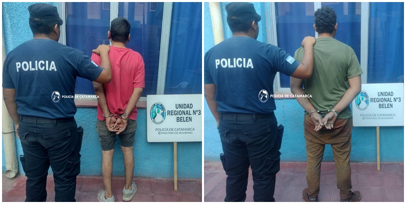 A las 06:20 de la mañana de ayer, en un local bailable de la Ciudad de Belén, Departamento homónimo, efectivos de la Comisaría Departamental procedieron a la aprehensión de dos jóvenes de apellidos Ortiz (27) y Chayle (28), quienes habrían amenazado y agredido físicamente a un Cabo 1° de Policía, que cumplía servicio adicional en el lugar, causándole lesiones que demandaron que fuera asistido por facultativos médicos del Hospital Zonal.
