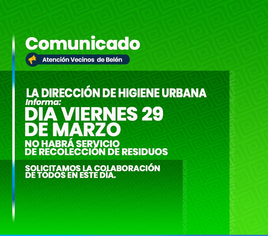 Desde la Dirección de Higiene Urbana de la Municipalidad de Belén informan que el día de la fecha viernes 29 de marzo NO HABRÁ RECOLECCIÓN DE RESIDUOS.