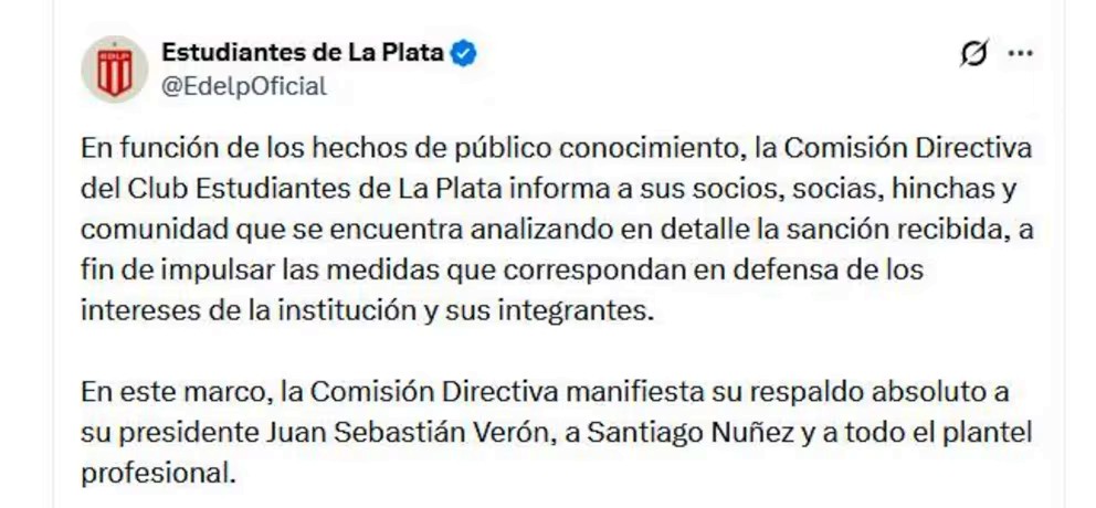 “En función de los hechos de público conocimiento, la Comisión Directiva del Club Estudiantes de La Plata informa a sus socios, socias, hinchas y comunidad que se encuentra analizando en detalle la sanción recibida, a fin de impulsar las medidas que correspondan en defensa de los intereses de la institución y sus integrantes. En este marco, la Comisión Directiva manifiesta su respaldo absoluto a su presidente Juan Sebastián Verón, a Santiago Nuñez y a todo el plantel profesional”, fue el comunicado de la entidad platense