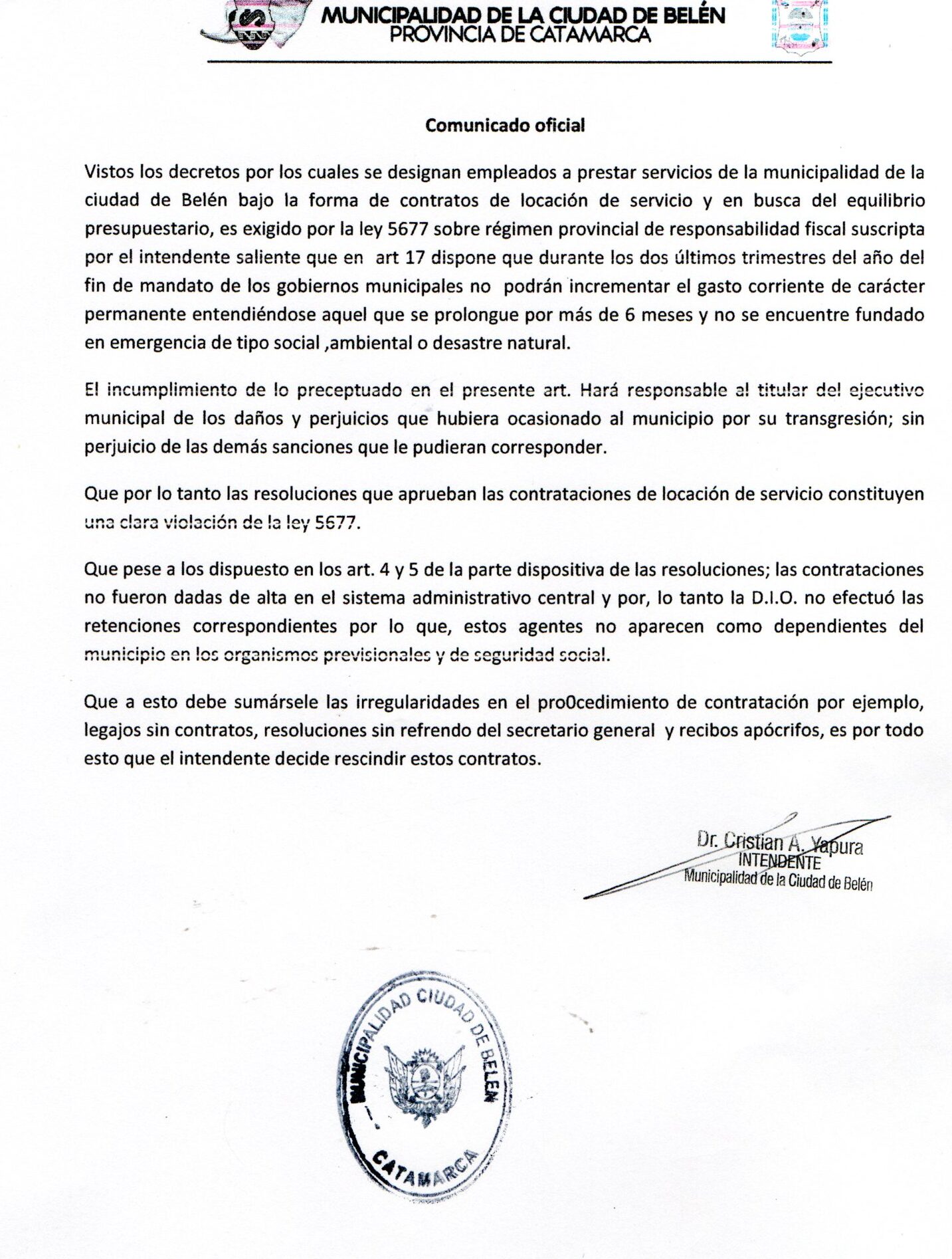 El Intendente de Belén Dr. Cristian Yapura dio a conocer un comunicado oficial donde rescinde los contratos dados de alta en los últimos 6 meses de la gestión anterior, el mismo comunicado expresa: