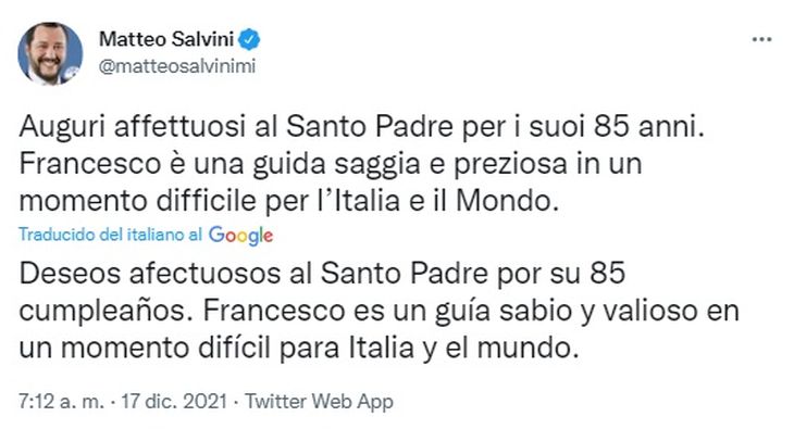 Incluso el líder derechista Matteo Salvini, líder de la Liga, destacó con un mensaje en Twitter a Francisco como «un liderazgo sabio y precioso en un momento difícil para Italia y el mundo» al saludarlo por el cumpleaños.