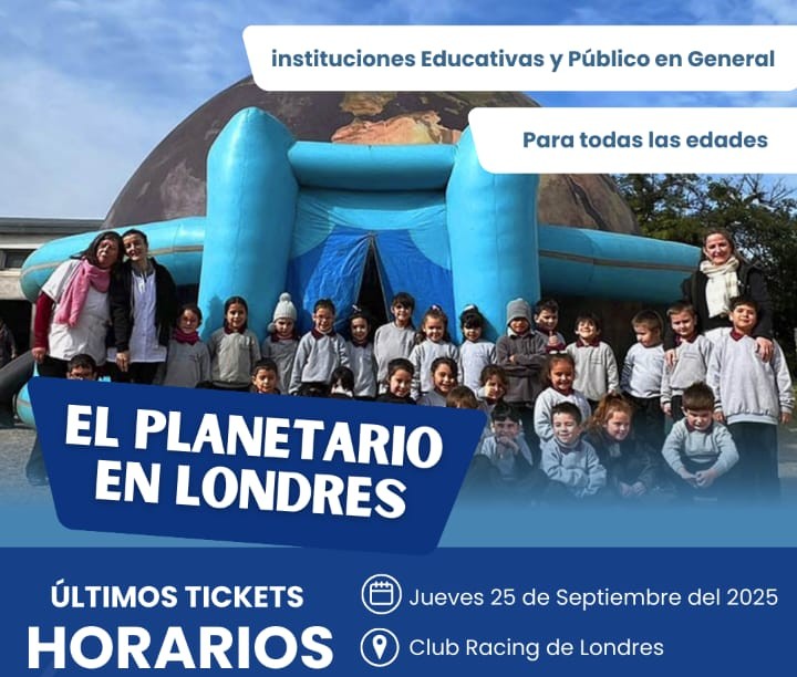 La Escuela Primaria N°40 «Juan Pérez de Zurita» de El Shincal, Londres, invita a toda la comunidad a una experiencia única y educativa: la llegada del planetario móvil al Club Racing de Londres. La actividad, de entrada libre y gratuita, se llevará a cabo el día de mañana jueves 25 de septiembre de 2025.