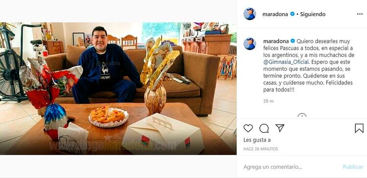 “Quiero desearles muy felices Pascuas a todos, en especial a los argentinos, y a mis muchachos de Gimnasia y Esgrima La Palta. Espero que este momento que estamos pasando, se termine pronto. Quédense en sus casas, y cuídense mucho. ¡Felicidades para todos!”, expresó el Diez en su cuenta oficial de Instagram con una foto que a simple vista lo tiene a él sentado en su sillón con dos huevos de chocolates grandes y una rosca de pascua.