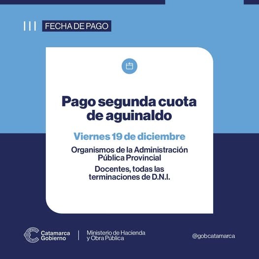 El Ministerio de Hacienda y Obra Pública comunica que el próximo viernes 19 de diciembre se acreditará en cuenta la segunda cuota del Sueldo Anual Complementario (SAC) a los agentes de organismos de la Administración Pública Provincial y docentes.