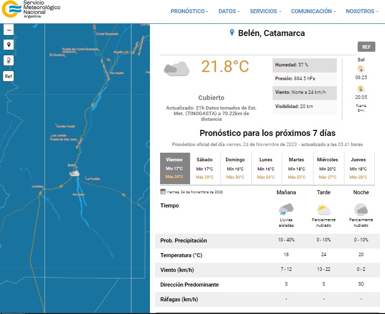 Según el Servicio Meteorológico Nacional, para hoy, viernes 24 de Noviembre, se espera por la mañana lluvias aisladas,  para la tarde parcialmente nublado y por la noche parcialmente nublado. Las temperaturas que alcanzarán 17° de mínima y 24° de máxima.