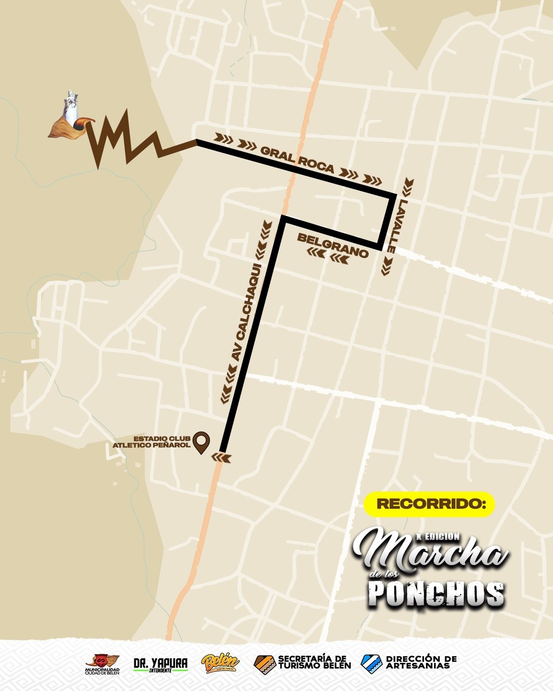 El recorrido inicia en los pies del Monumento de la Virgen de Belén con el descenso del Poncho más grande (prenda realizada artesanalmente de 16 metros de largo simbolizando los departamentos que componen la provincia) se continúa por calles Gral. Roca, Lavalle, Belgrano, Av. Calchaquí hasta llegar a el Club Peñarol donde se efectuará la apertura de la Feria Cuna del Poncho.