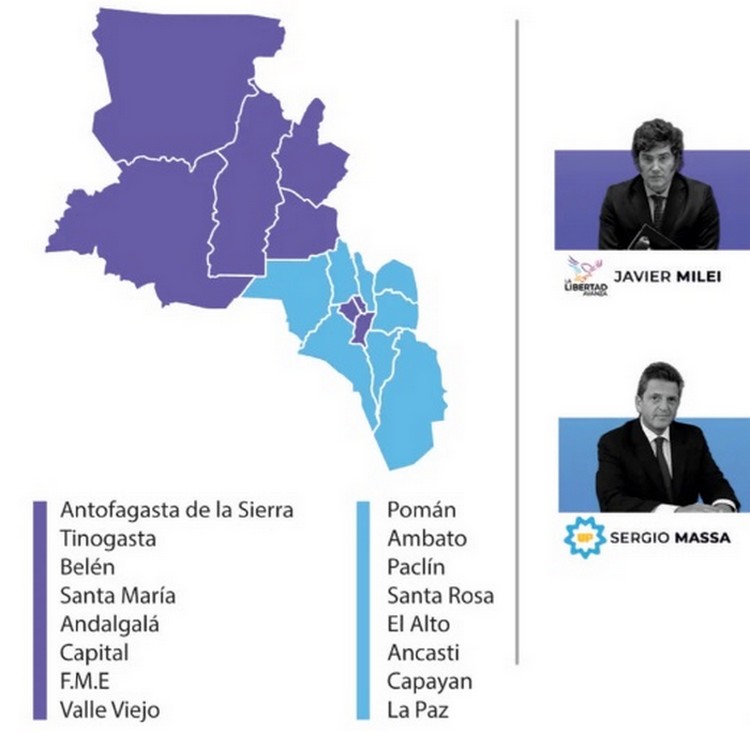 Según los últimos datos, en los departamentos del Valle Central (Capital, Valle Viejo y Fray Mamerto Esquiú) y en casi todo el oeste (Antofagasta de las Sierras, Tinogasta, Belén, Santa María y Andalgalá), Javier Milei se impuso.