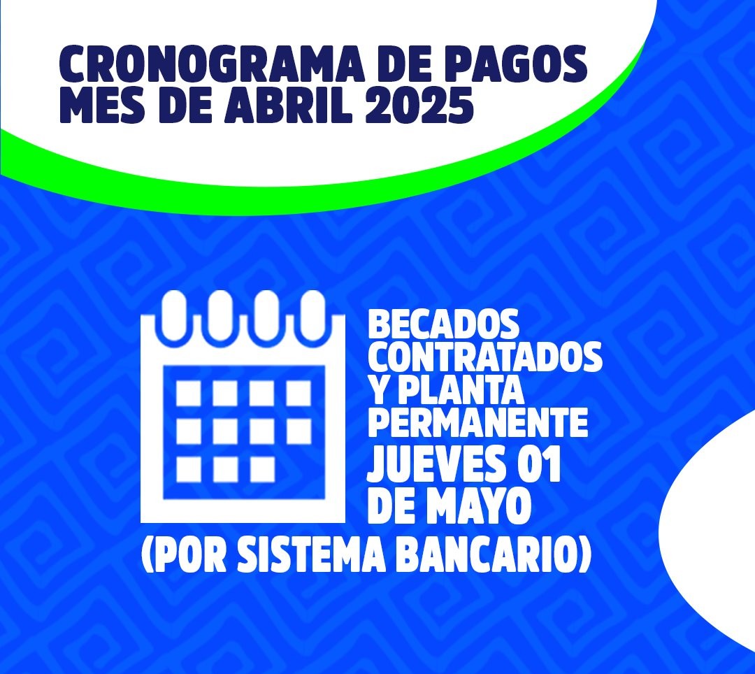 Se comunica que el pago para Becados, Contratados y Personal de Planta Permanente se efectuará el día jueves 01 de mayo de 2025.