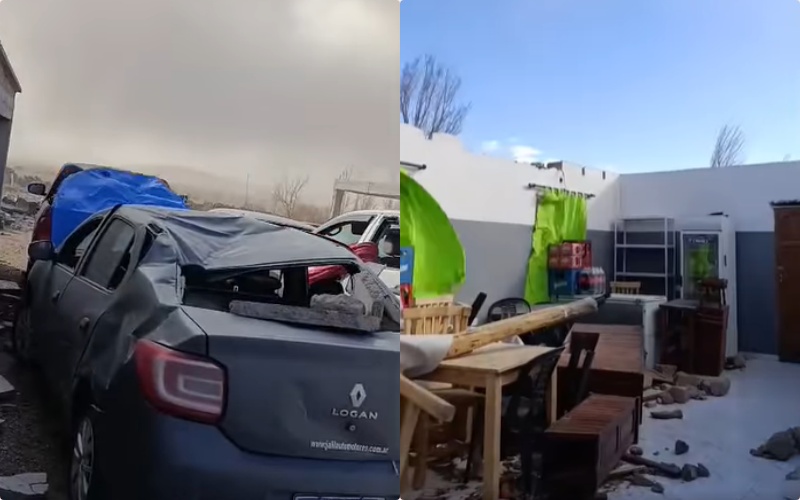 Según testimonios de personas que se encuentran en el lugar, se registraron ráfagas constantes de entre 100 y 120 km/h, lo que provocó graves destrozos materiales, como techos volados, vidrios destruidos en camionetas y piedras que vuelan por los aires, haciendo imposible circular por las calles.
