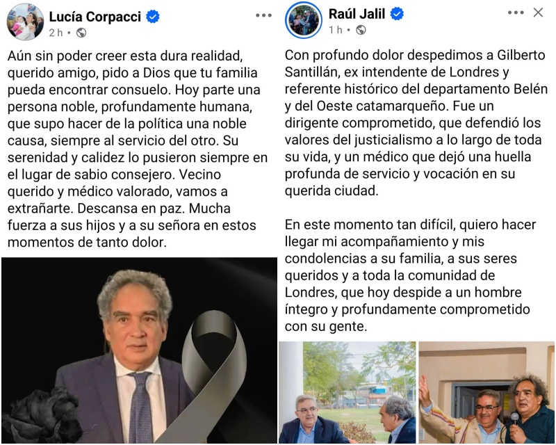 La trágica muerte de Gilberto Santillán, exintendente de Londres (Belén), causó una profunda conmoción en la política catamarqueña. Reconocido por su compromiso social, su trayectoria en el justicialismo y su rol como médico, Santillán fue despedido con sentidas palabras por dirigentes de peso como la senadora nacional Lucía Corpacci y el gobernador Raúl Jalil.