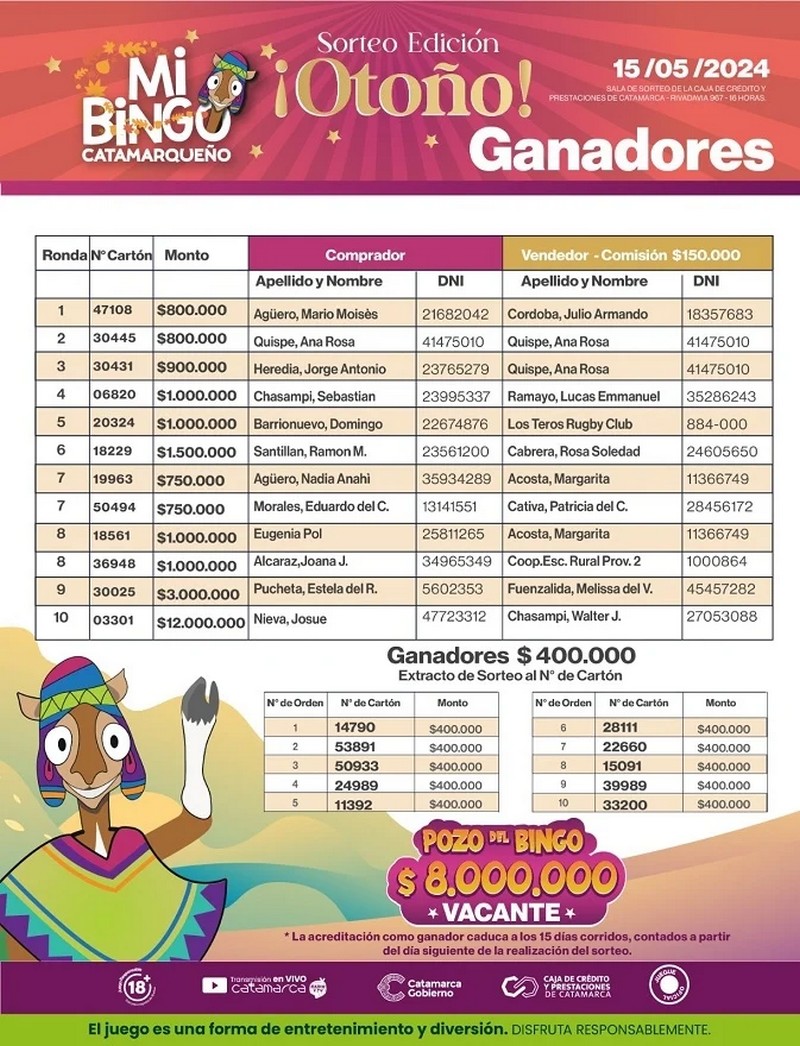 En esta ocasión única, se repartieron más de 38 millones de pesos en premios durante esta edición. Además, el pozo del bingo presentó una oportunidad adicional: cualquiera que participara hasta la bolilla 36 tenía la oportunidad de ganar un premio extra de $8.000.000, el cual quedó vacante.
