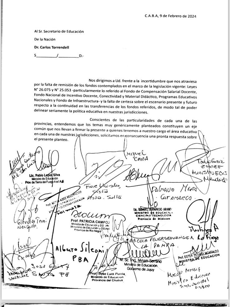 «Nos dirigimos a usted frente a la incertidumbre que nos atraviesa por la falta de remisión de fondos contemplados en el marco de la legislación vigente, particularmente lo referido al Fondo de Compensación Salarial Docente, Fondo Nacional de Incentivo Docente, Conectividad y Material Didáctico, Programas Educativos Nacionales y Fondo de Infraestructura», manifestaron los ministros.
