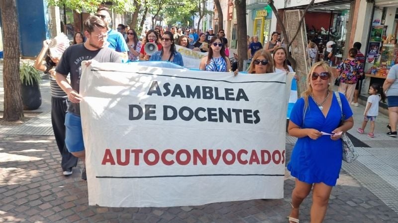 Al grito de "sin aumento no hay clases", un numeroso grupo de docentes autoconvocados marcharon por la Peatonal Rivadavia para concentrarse en las escaleras de la Escuela Belgrano, ubicada sobre la misma peatonal.