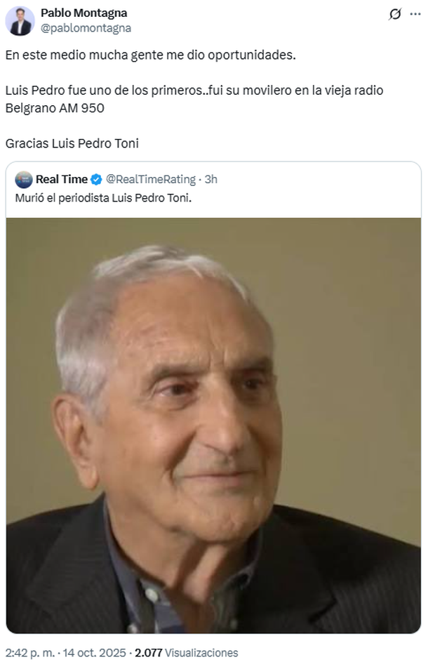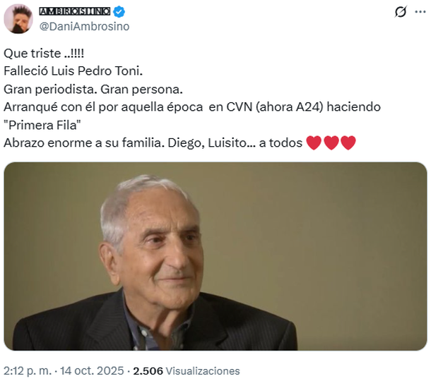 Por su parte, Daniel Ambrosino expresó: “Qué triste. Falleció Luis Pedro Toni. Gran periodista, gran persona. Arranqué con él por aquella época en CVN (ahora A24) haciendo Primera Fila. Abrazo enorme a su familia”.