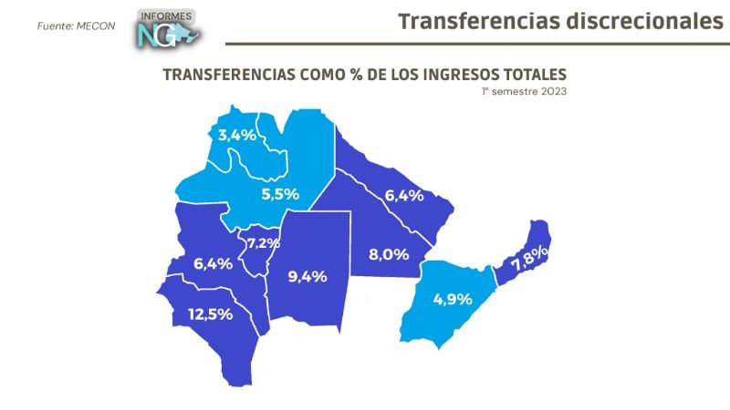 En el mapa nacional, hay fuertes brechas en la participación de estas transferencias sobre el total de ingresos de las provincias: al primer semestre del 2023, en La Rioja se observa el mayor nivel (12,5% de los ingresos) y en Neuquén el más bajo (1,9%).