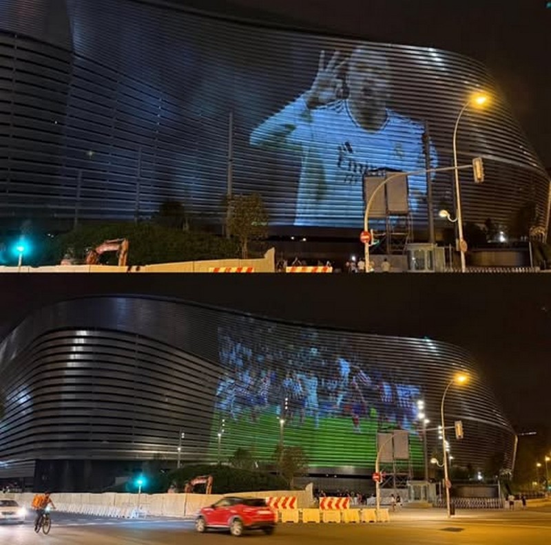 El estadio del Real Madrid probó un sistema de video mapping con proyectores 4K que permiten mostrar imágenes y videos sobre su fachada metálica