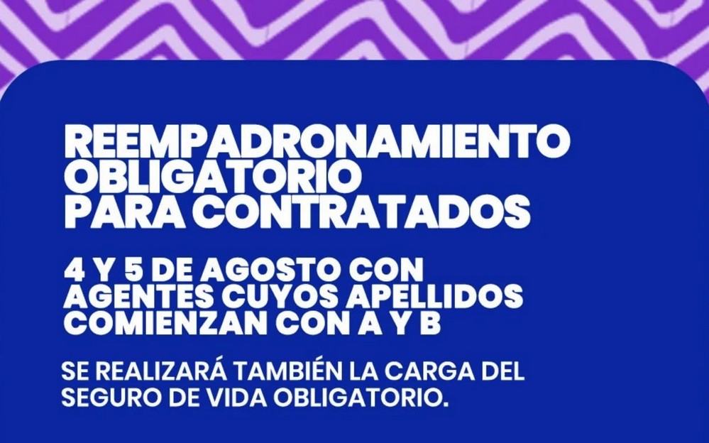 Este proceso, que incluye la carga del Seguro de Vida Obligatorio, se llevará a cabo en la Dirección de Personal en el siguiente horario: 7:00 a 12:00 hs.