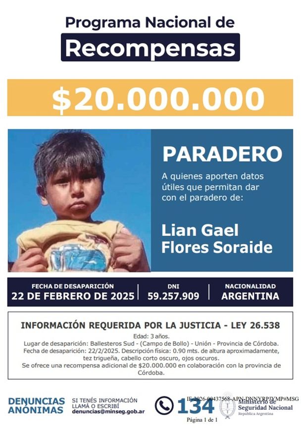 Lian tenía apenas tres años cuando fue visto por última vez el 22 de febrero de 2025 en Ballesteros Sud, una pequeña localidad cordobesa. Desde entonces, la causa se mantiene abierta y bajo investigación judicial, con múltiples líneas de trabajo que, hasta el momento, no lograron determinar qué ocurrió con el niño. La actualización del monto de la recompensa fue dispuesta mediante la Resolución N°52/2026 y forma parte de una estrategia oficial para reactivar la búsqueda y estimular la colaboración ciudadana.