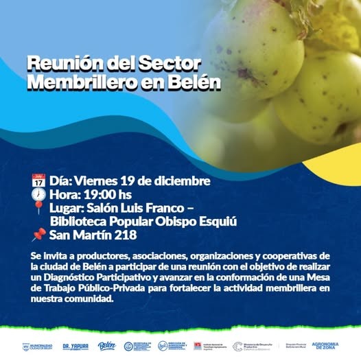 Este viernes 19 de diciembre, a las 19:00 hs, se llevará a cabo una reunión del sector membrillero de Belén en el Salón Luis Franco de la Biblioteca Popular Obispo Esquiú (San Martín 218).