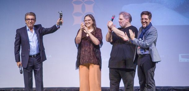Fueron el director artístico y el presidente del Festival, Pablo Code y Fernando Juan Lima, respectivamente, quienes hicieron la entrega del galardón al actor que subió al escenario a recibirlo de saco azul, camisa clara y anteojos.