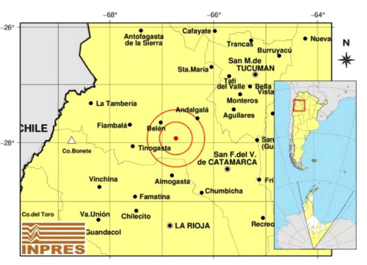 De acuerdo con el reporte preliminar del organismo, el movimiento telúrico tuvo su epicentro a 42 kilómetros al sureste de Belén, a 56 kilómetros al suroeste de Andalgalá y a 71 kilómetros al norte de Aimogasta. El evento se localizó en las coordenadas -27.925 (latitud) y -66.731 (longitud).