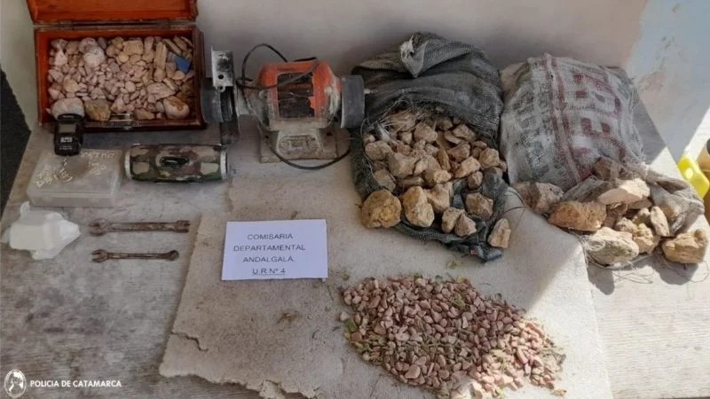 Cabe señalar que, en el inmueble, los policías encontraron un motor de máquina marca «Dowenrgio» y un parlante, que serían producto del hecho denunciado, por lo que quedaron en calidad de secuestro, al igual que dos bolsas arpilleras que contenían piedras rodocrositas, pastillas de Clonazepam, varias plantas y plantines aparentemente de la variedad Cannabis Sativa y un envoltorio de plástico, que contenía en su interior una sustancia herbácea que se trataría de Marihuana, en virtud de lo cual se dio intervención a personal del Grupo Antinarcóticos de Unidades Regionales (GAUR- Andalgalá), quien realizó tareas de su especialidad, tomando intervención el Juzgado Federal.