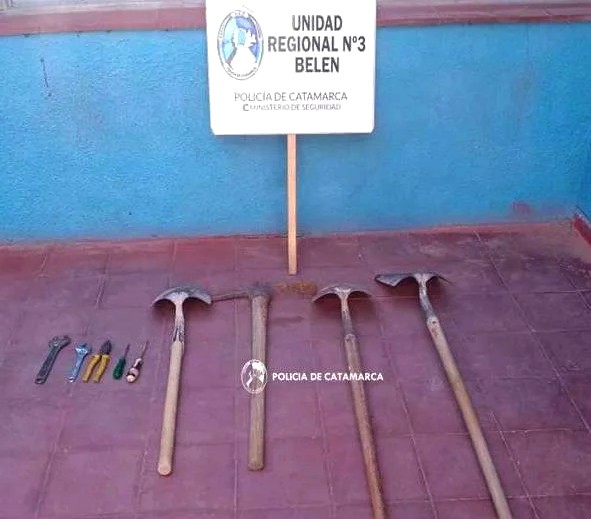 En el lugar, los policías recuperaron tres palas, un pico de desmonte, dos destornilladores, una pinza multifunción y dos llaves francesas, que quedaron en calidad de secuestro a disposición de la Justicia interviniente, desde donde se indicaron las medidas a cumplimentar.