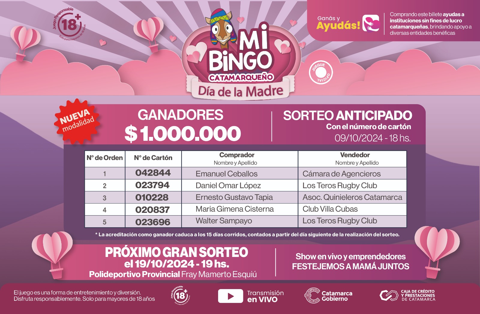 Sortearon 5 millones de pesos en el anticipado de Mi Bingo Catamarqueño del día de la madre