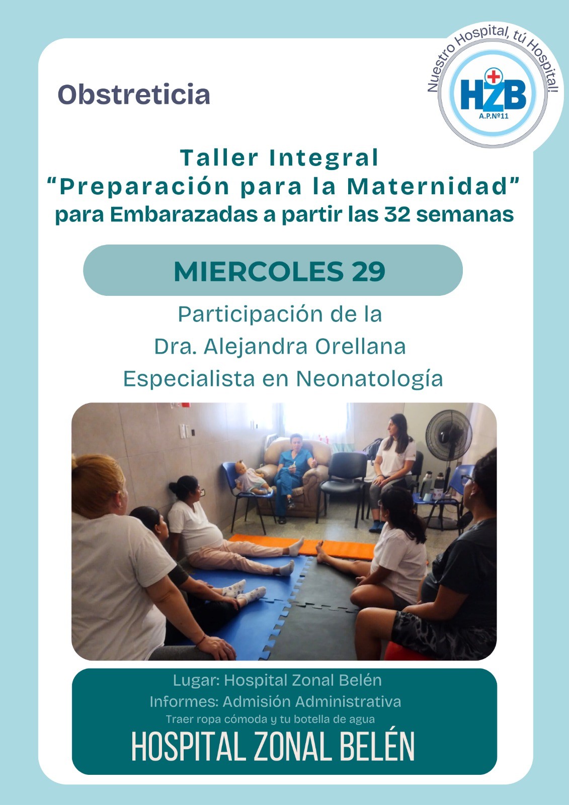 El Hospital Zonal Belén invita a todas las futuras mamás que se encuentren a partir de las 32 semanas de embarazo a participar del Taller Integral “Preparación para la Maternidad”. El taller contará con la participación de la Dra. Alejandra Orellana, especialista en Neonatología.