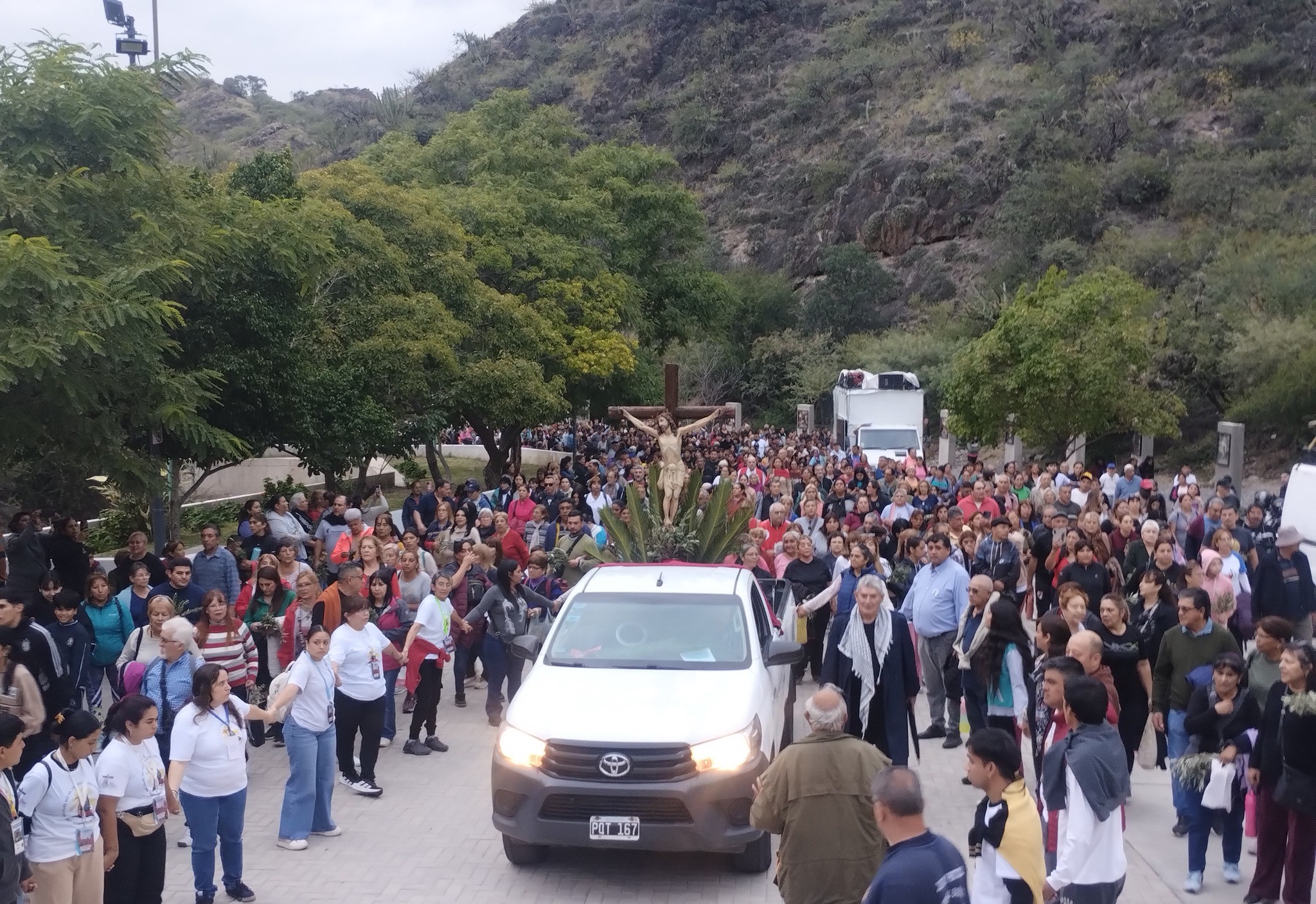 A su arribo, en la explanada del Santuario de la Gruta, el obispo bendijo los ramos de olivo y junto con los fieles realizó la procesión, imitando la entrada triunfal de Jesús en Jerusalén, hasta el altar donde presidió la santa misa, concelebrada por los sacerdotes presentes.