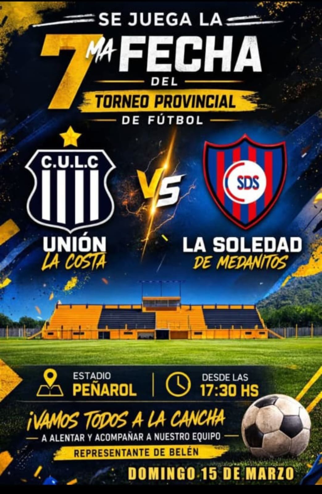 Desde las 17:30 horas, el Estadio Peñarol será el escenario donde Unión La Costa se medirá ante La Soledad de Medanitos (Fiambalá). El equipo belicho llega a este encuentro con la firme intención de sostener su gran presente futbolístico y mantenerse en lo más alto de la Zona 2 de la tabla.