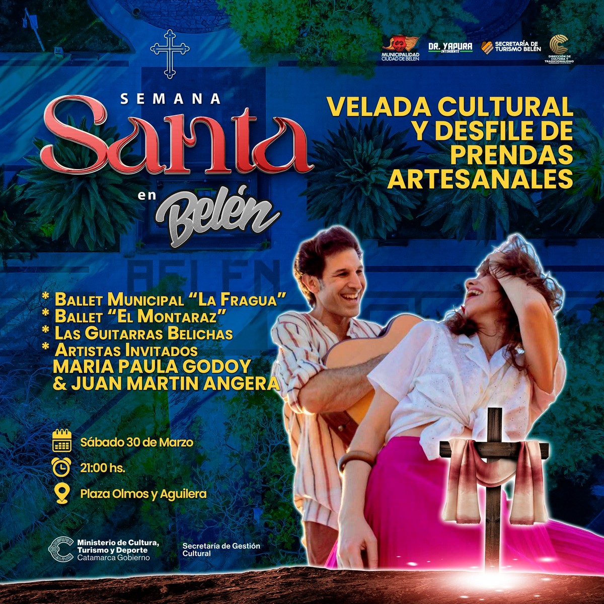 Para este sábado 30 de marzo en el marco del programa de actividades de Semana Santa en la ciudad de Belén, se llevará a cabo a partir de las 21:00 horas la Velada Cultural y desfile de prendas artesanales en Plaza Olmos y Aguilera.